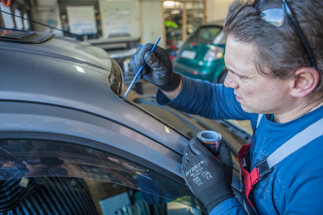 Steinschläge sollten möglichst gleich repariert werden, dabei sollte kein Wasser und Schmutz eindringen. Dies kann mit Steinschlagpflaster oder einem Streifen transparentem Klebefilm verhindert werden.